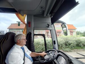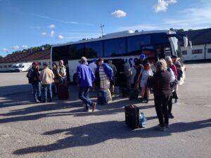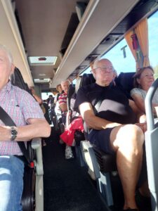 Bussfärden påbörjades redan 08.00. Alla fick morgonfika i form av kaffe/te´ och fralla. Under bussfärden genomfördes en sedvanlig trav-quiz, ett mycket uppskattat inslag varje år. Rolf har vunnit de två senaste åren och han var stor favorit även denna gång. För att i någon mån utjämna chanserna startade Rolf nu på tre tillägg. Men det hjälpte inte. Han vann åkandes. Handicappern (läs Yngve) måste skärpa sig nästa år och tilldela Roffe ytterligare tillägg, är den givna slutsatsen.